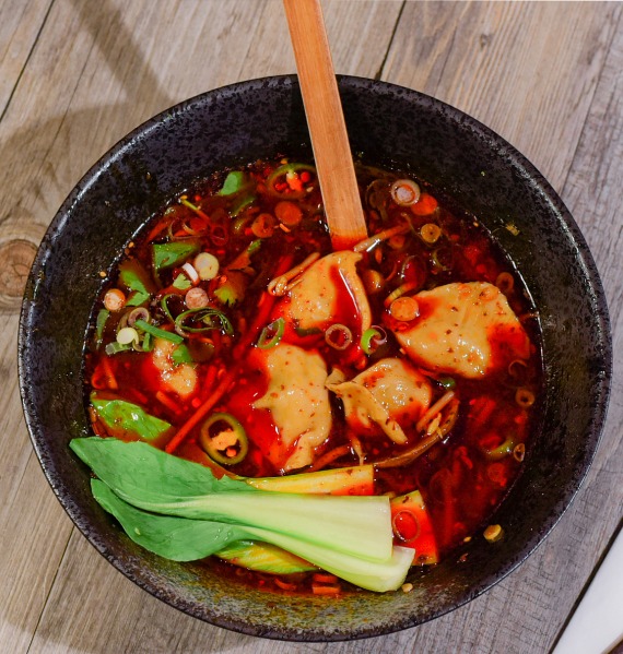 Soupe de ravioli au porc à la sauce piquante avec trois gouttes de Champagne